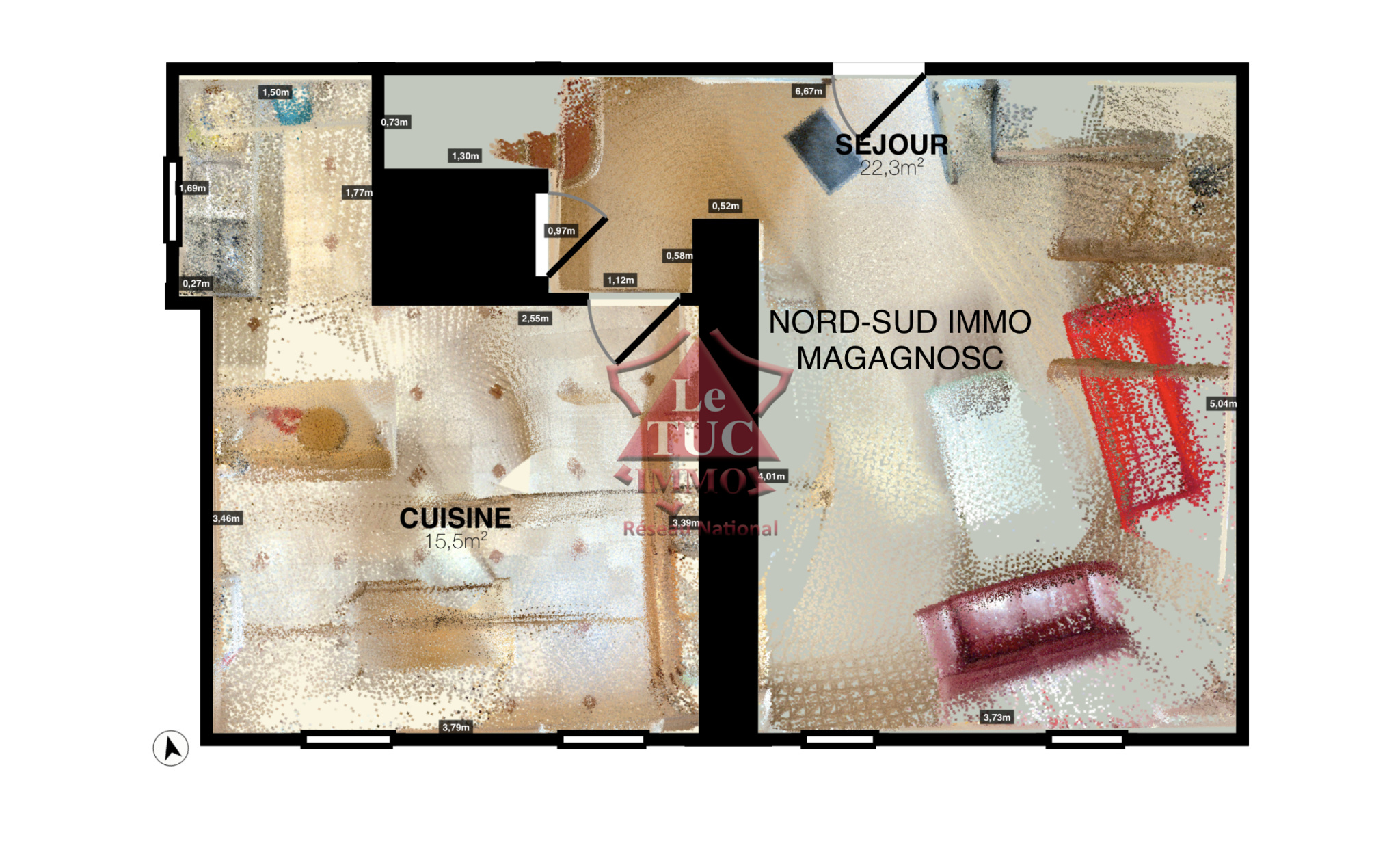 Séjour, cuisine avec salle à manger, deux chambres à l'étage avec deux salle de bains et toilettes.