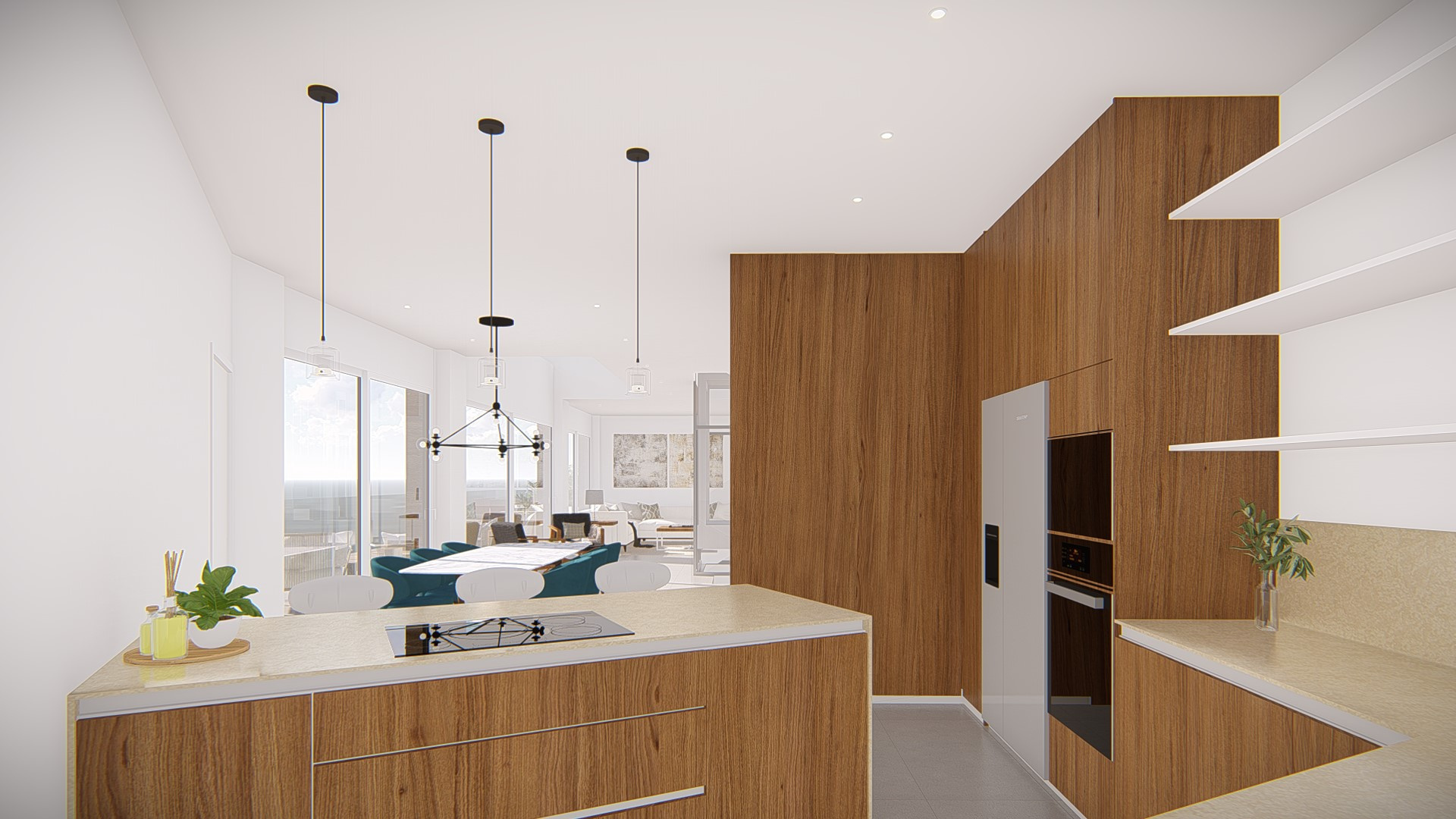Cuisine entièrement équipée avec portes d’armoire à fermeture souple.