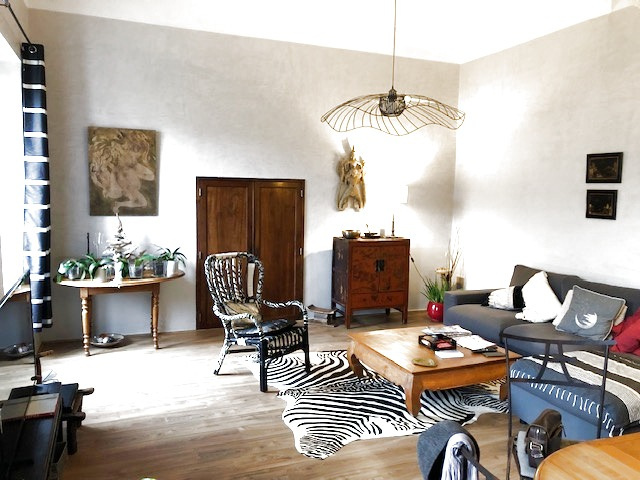 Vous découvrirez également une superbe pièce de vie voûtée de 30 m², avec cheminée ouverte, offrant une atmosphère chaleureuse et authentique. Un bureau lumineux de 26,30 m², avec vue sur le village, peut aisément être transformé en second salon ou atelier d'artiste.