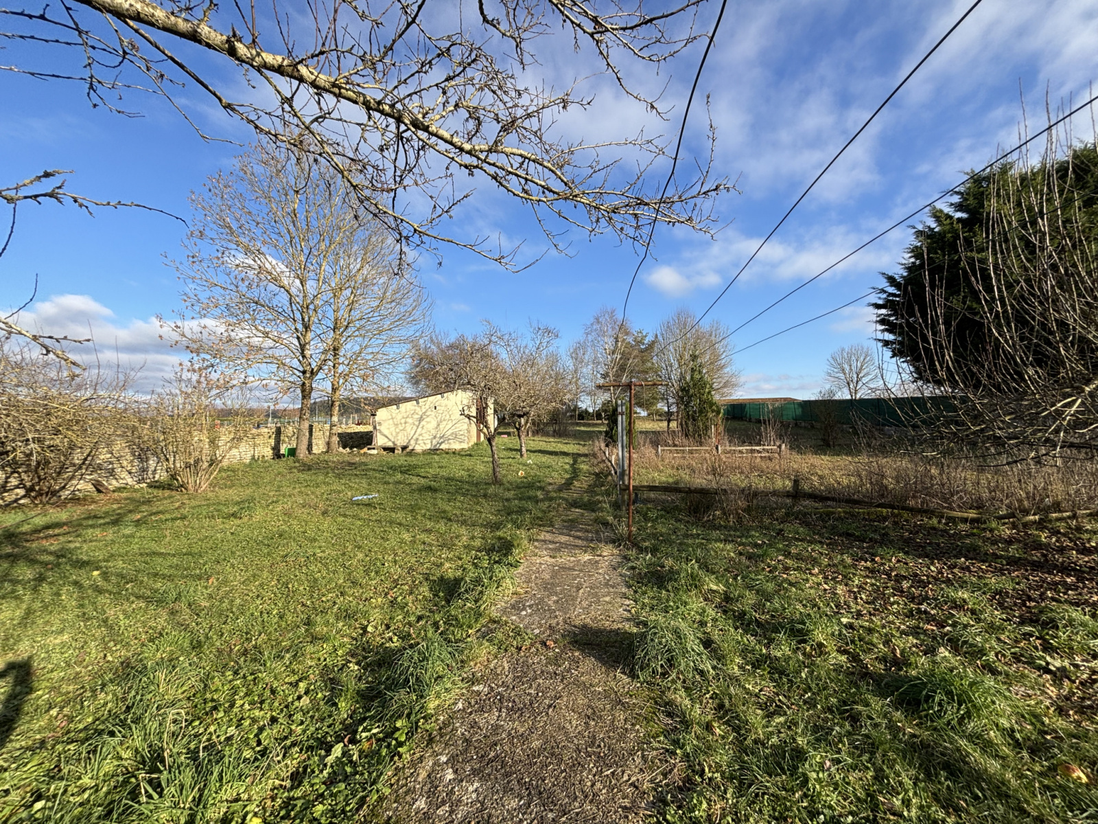 A l'extérieur, le terrain de 3200 m² est clos et comprend les dépendances citées, un verger avec de nombreux fruitiers et deux cabanes de jardin.