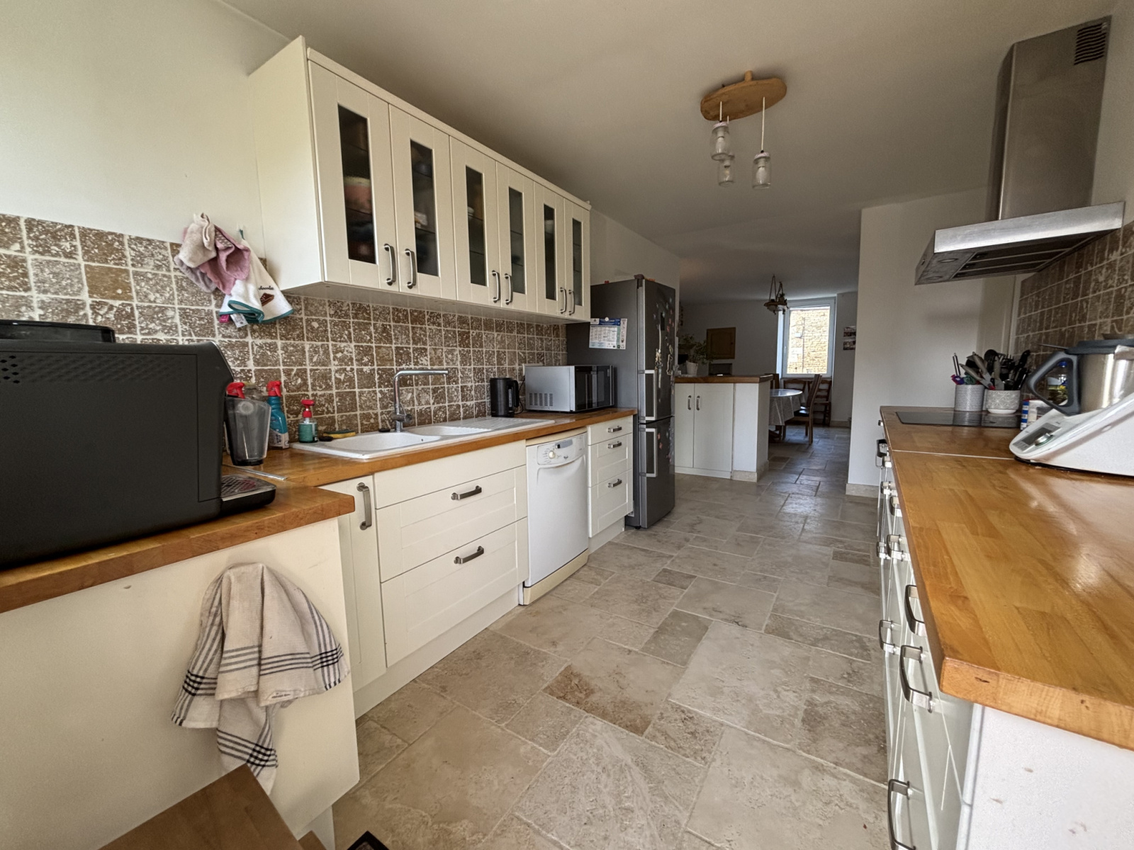 Le côté cuisine, moderne, avec cellier s'ouvre sur un grand salon de 30 m² environ avec deux baies, terrasse et pergola.