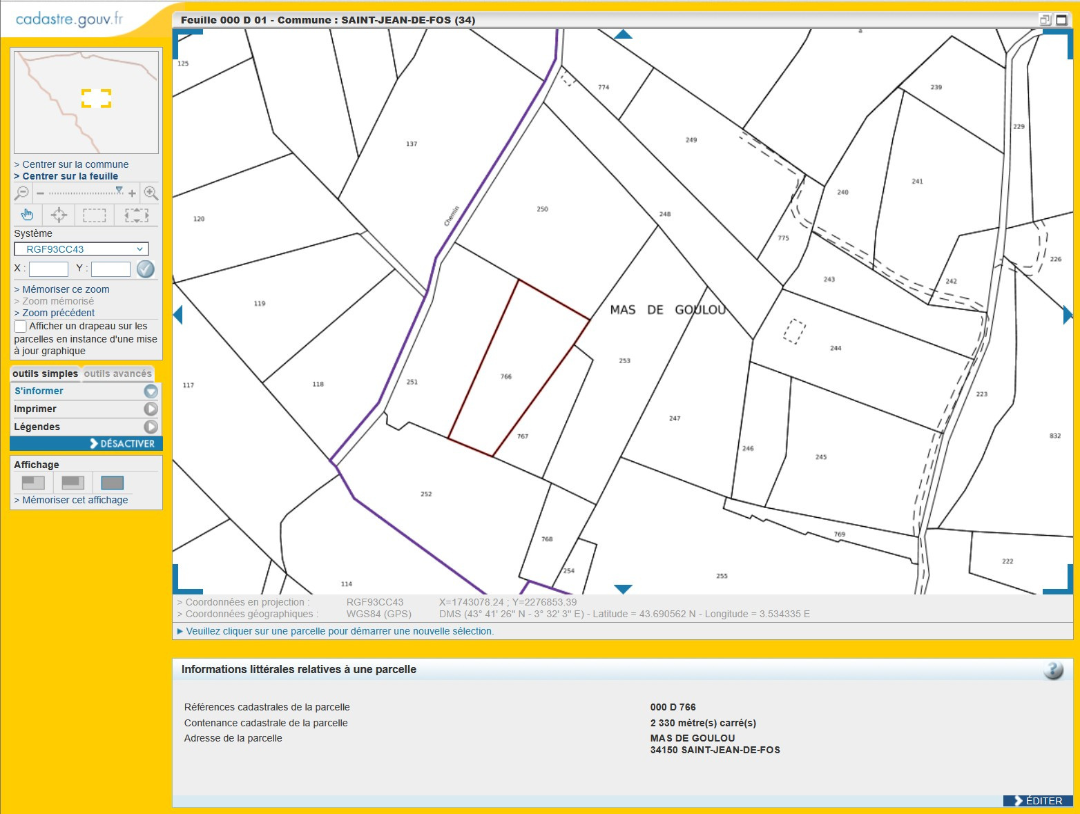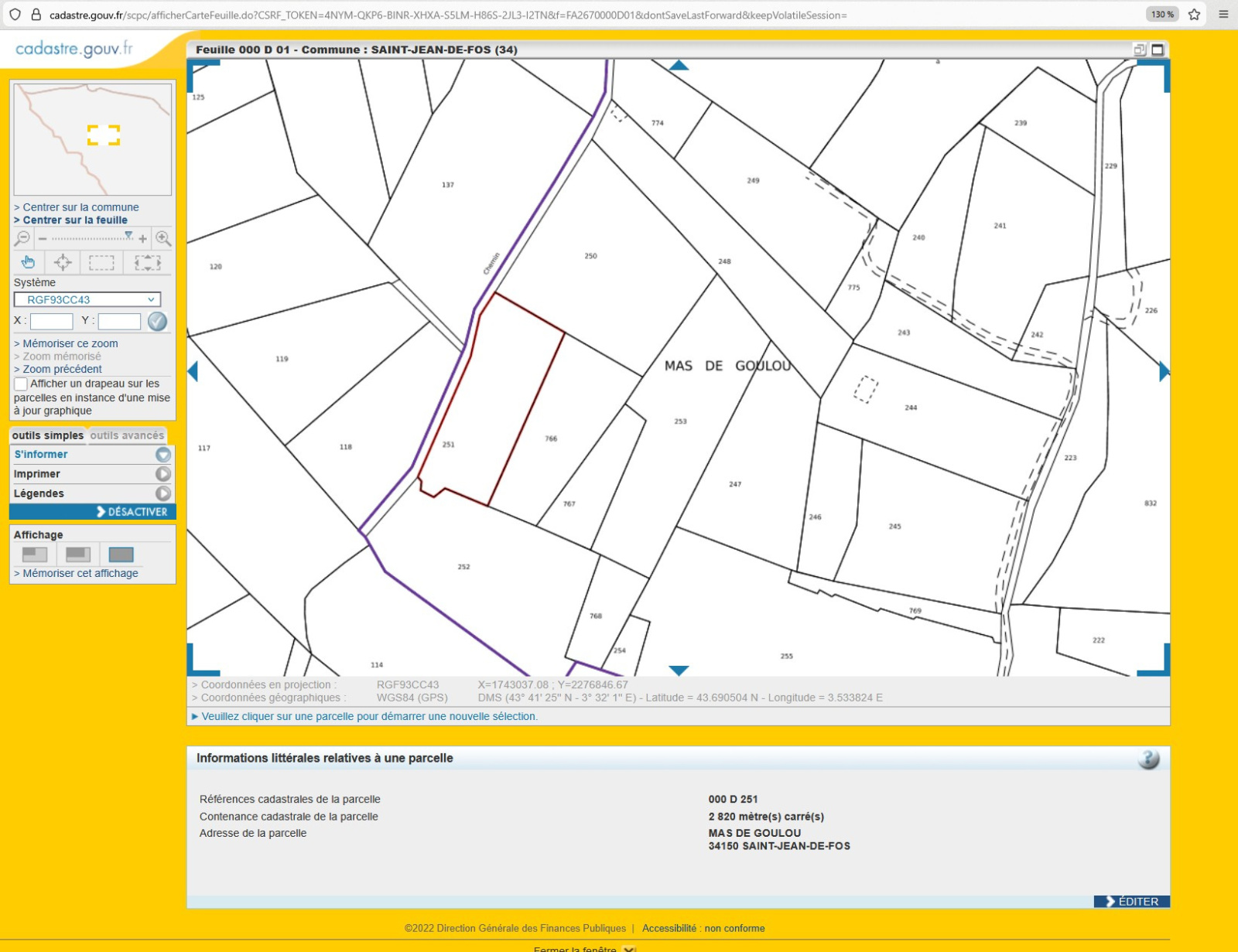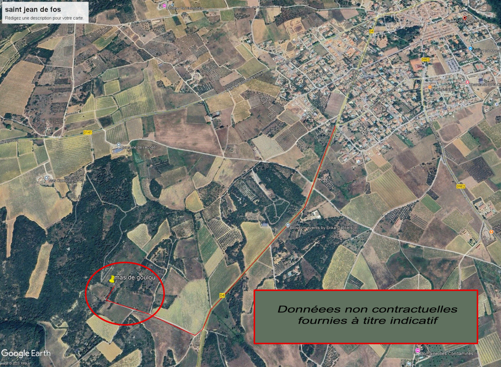 Lot de deux parcelles agricoles mitoyennes d'une superficie totale de 5150 m² cadastrées D251 de 2820 m² et D766 de 2330 m² , au sud est de St-Jean de Fos, lieu dit "Mas Goulou" .